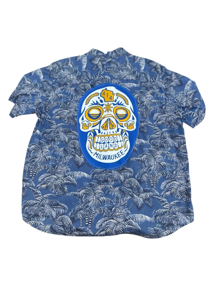 Upcycled Chaps button up w Milwaukee Skull patch sewn on