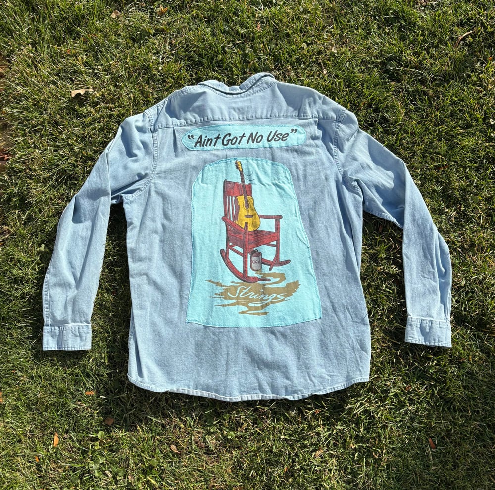 Wrangler denim shirt with Red rocking chair made from tshirt, sewn by me.