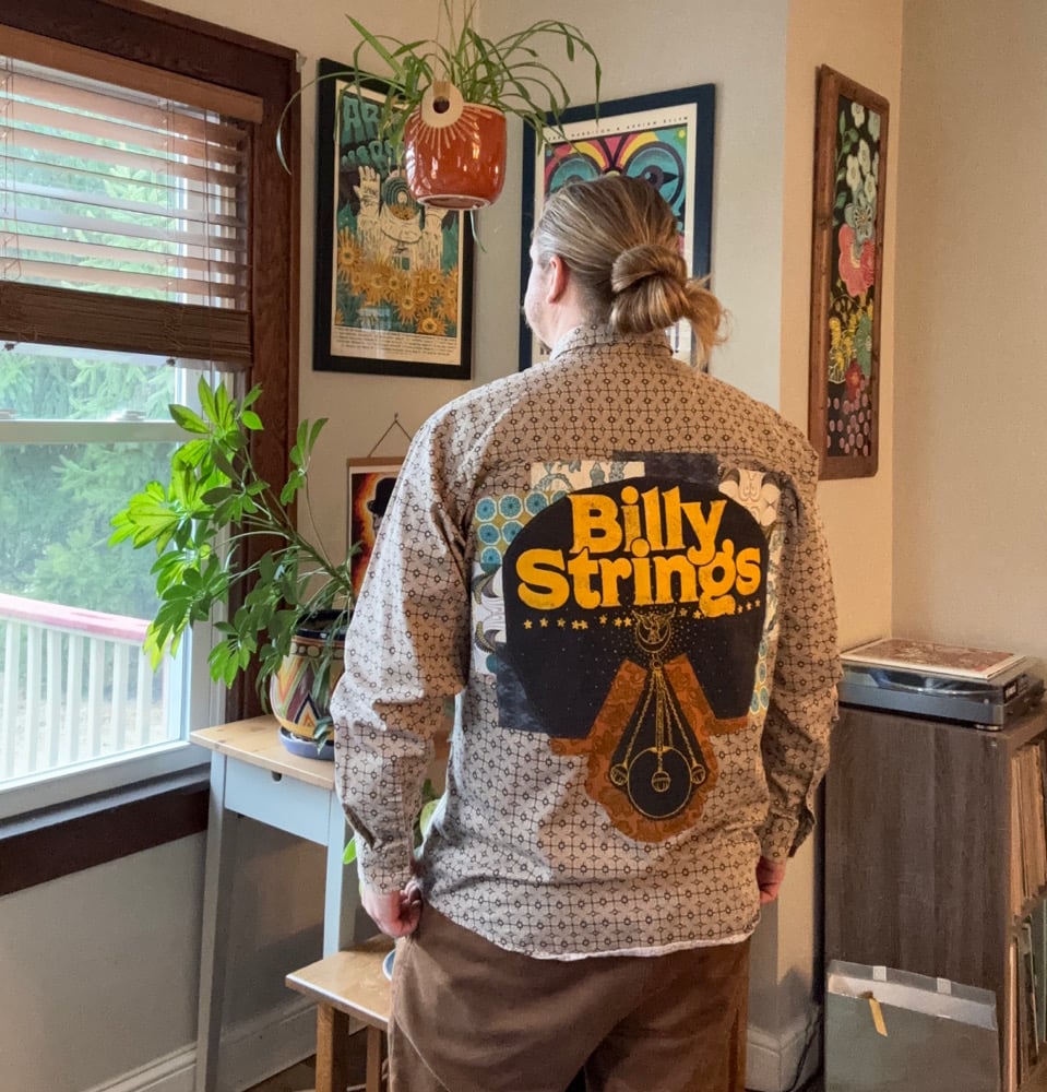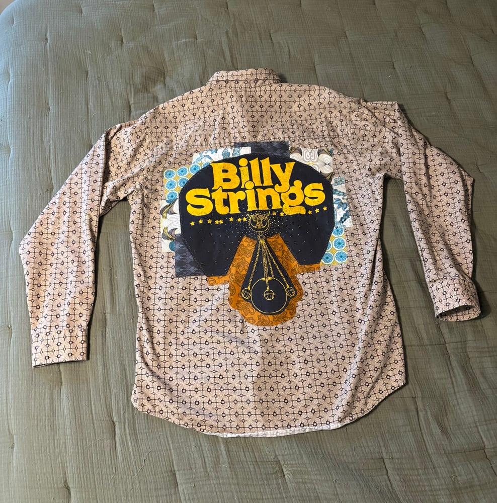 Official Billy Strings tee made into a patch and sewn onto an upcycled Natural Issue Button Up - tagged Large Tall - fits like an XL