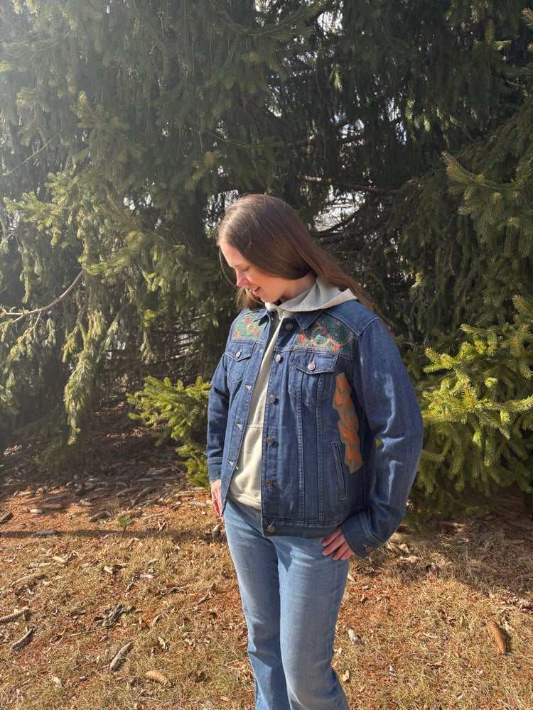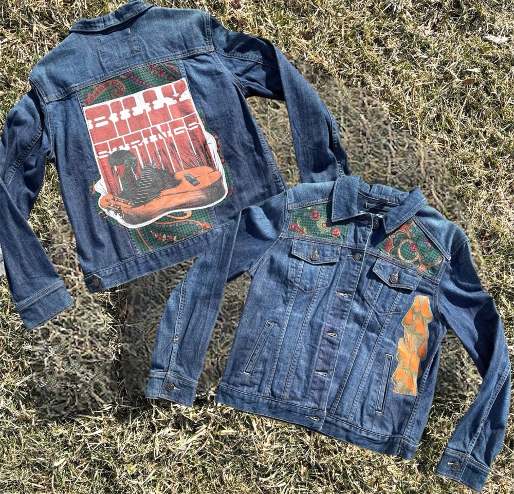 Official Billy Strings tee made into patch sewn onto upcycled Eddie Bauer light demin jacket - women’s Large
