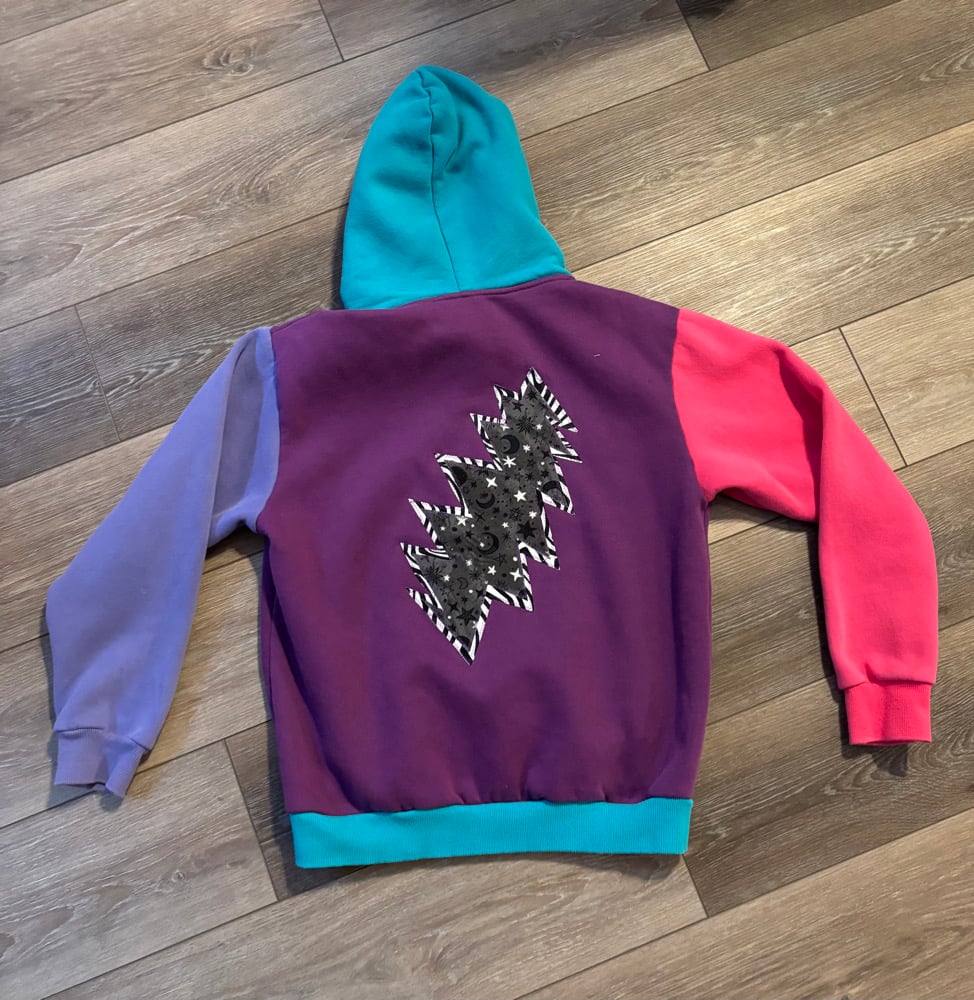 Upcycled Hoodie w bolt patch cut and sewn by me. Hoodie is a medium, fits on the small side of medium. Thick hoodie